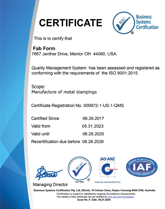 Fab Form is registered and conforms with ISO 9001:2015 standards and participates in ongoing assessments to validate compliance within the scope of manufacturer of metal stampings. We are validated by Business Systems Certification, a prestigious accreditation body.